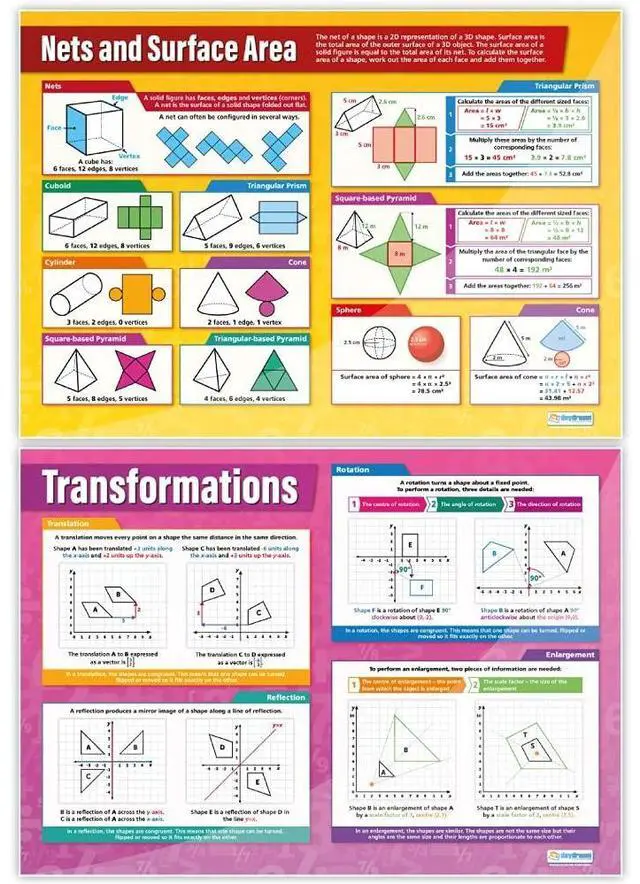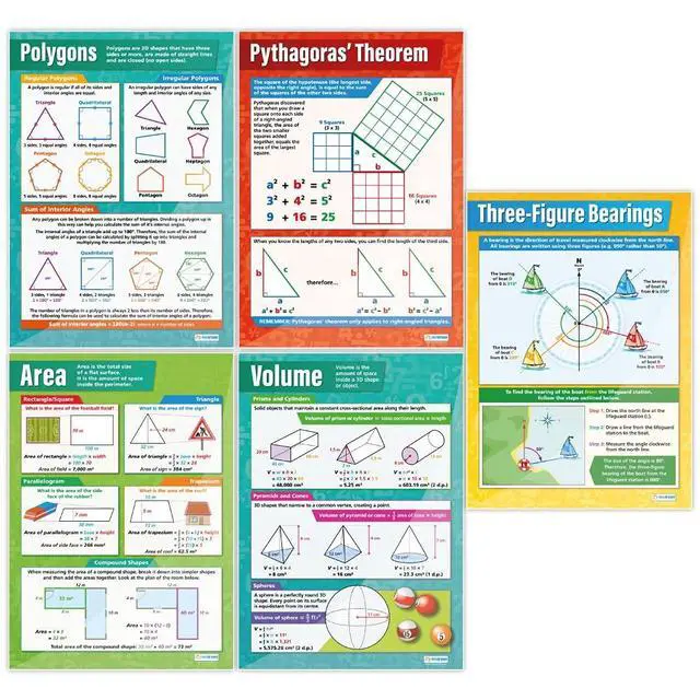 EDUCATIONAL CHARTS DESIGNED BY TEACHERS: Our Set of 13 Geometry & Measures posters has been designed to help students get to grips with the core math concepts of calculating shape properties like angles, area, and volume. Popular topics covered include Angle Properties, Pythagoras Theorem, Trigonometry, Circle Theorems, Transformations, Bearings, Surface Area, Volume, and Nets.