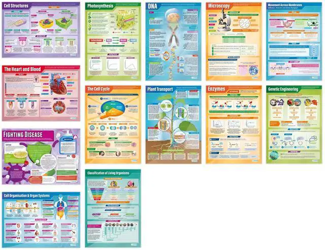 Educational Charts Designed By Teachers This set of 13 biology posters was developed by educators to simplify complex life science topics through bold visuals and concise summaries. Each chart supports instruction in grades 710 and includes key concepts such as The Cell Cycle, Enzymes, Photosynthesis, DNA, and more. These colorful educational posters help students absorb challenging content while supporting various learning styles. ^^ Aligned to Core Curriculum Standards Perfect for middle and high school classrooms, these science posters for classroom align with current teaching frameworks and support visual learners during lessons, test prep, or review sessions.