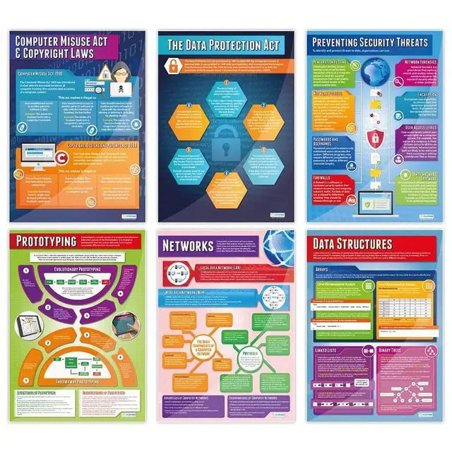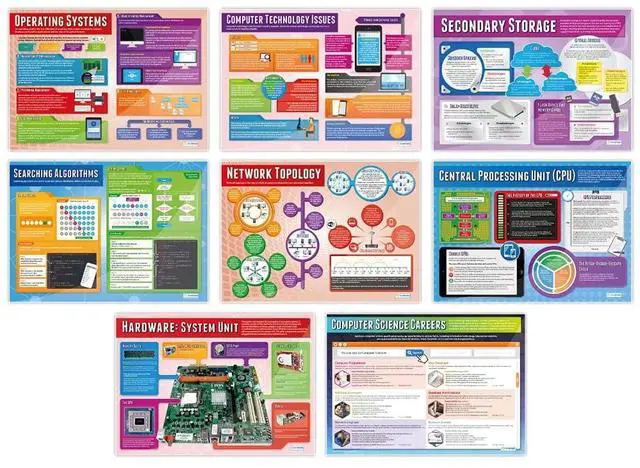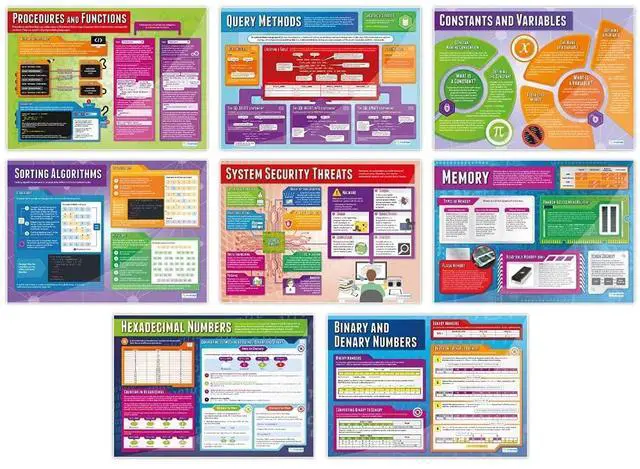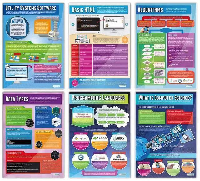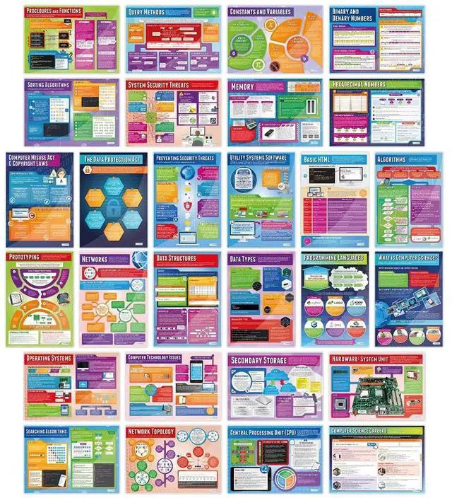 EDUCATIONAL CHARTS DESIGNED BY TEACHERS: Our set of 32 Computer Science posters help students to learn, engage and remember more information than ever before. Covering a range of core computer science topics, these unique school posters can play a vital role in improving both students' understanding and classroom decor.
