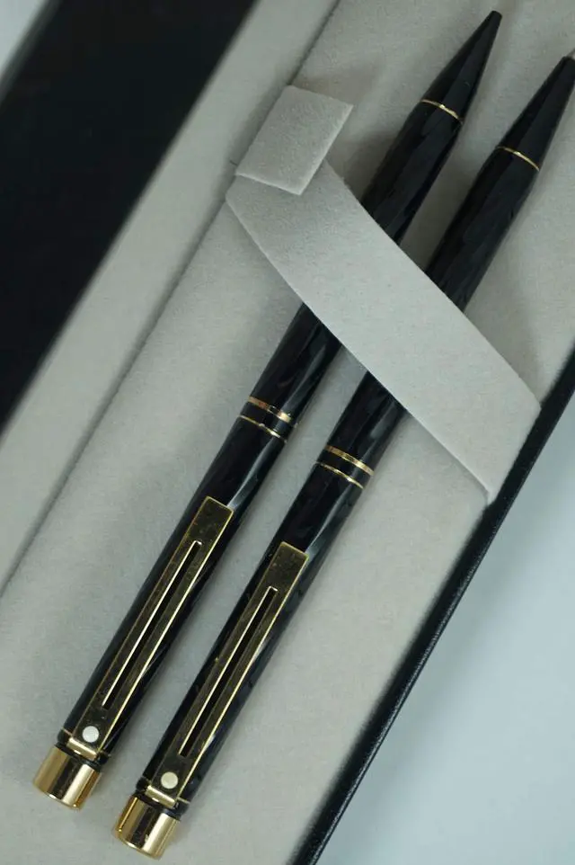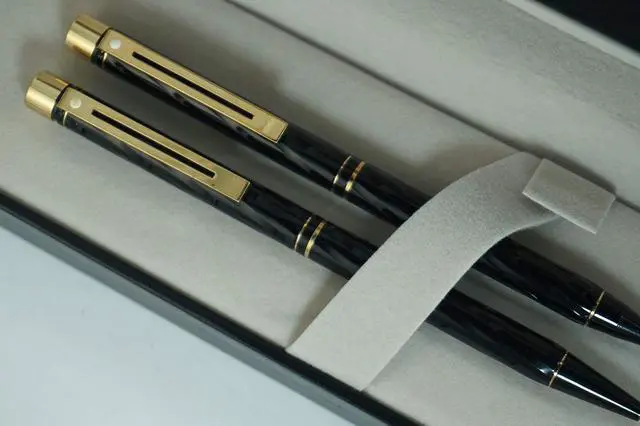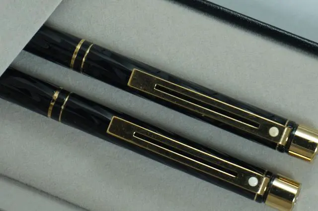 Sheaffer Made in the USA Signature Targa Spiral black Lacquer Barrel with Signature Targa Centre Gold rings and 22KT Gold appointments ballpoint Pen and 0.5MM pencil set is a rare collectible today. This set was made in Iowa. Add a burst of color to your writing and your wardrobe. A traditional favorite meets modern and contemporary. Targa Targa Spiral black Lacquer Signature boasts signature rings and black spiral Barrel finishes in a new line of premium everyday writing instruments by Sheaffer which is now owned by A. T. Cross. At home or in the office this Signature pen delivers the high quality and reliability you expect in a Cross - Sheaffer writing instrument.