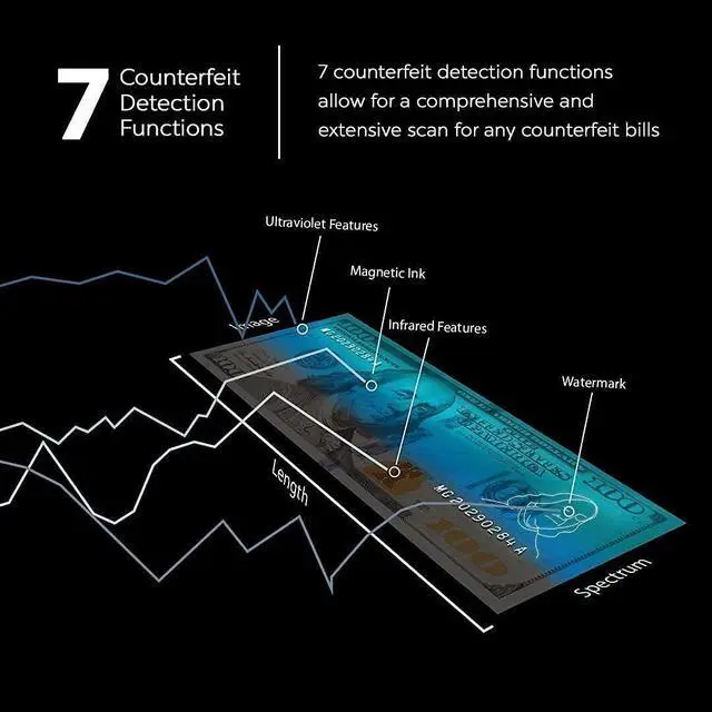 SEC: Equipped with 7 Counterfeit Detection methods including UV, WM, MG, IR, DD, IMG, CS. This units automatic feeding system scans the bill and notifies the user through audible and visual alerts if the bill has passed or failed the counterfeit detection test. ^^