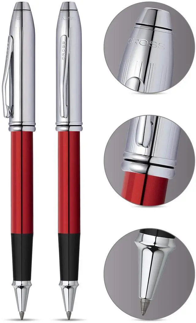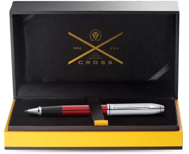 Cross Townsend Rollerball Red/Chrome Type of refill: Cross 8523. Refill design: line width 0.7 mm, replaceable. Ink colour: black, indelible. Pen design: metal, varnish. Clip: Chrome cap can be inserted. Comes in a luxury gift box.