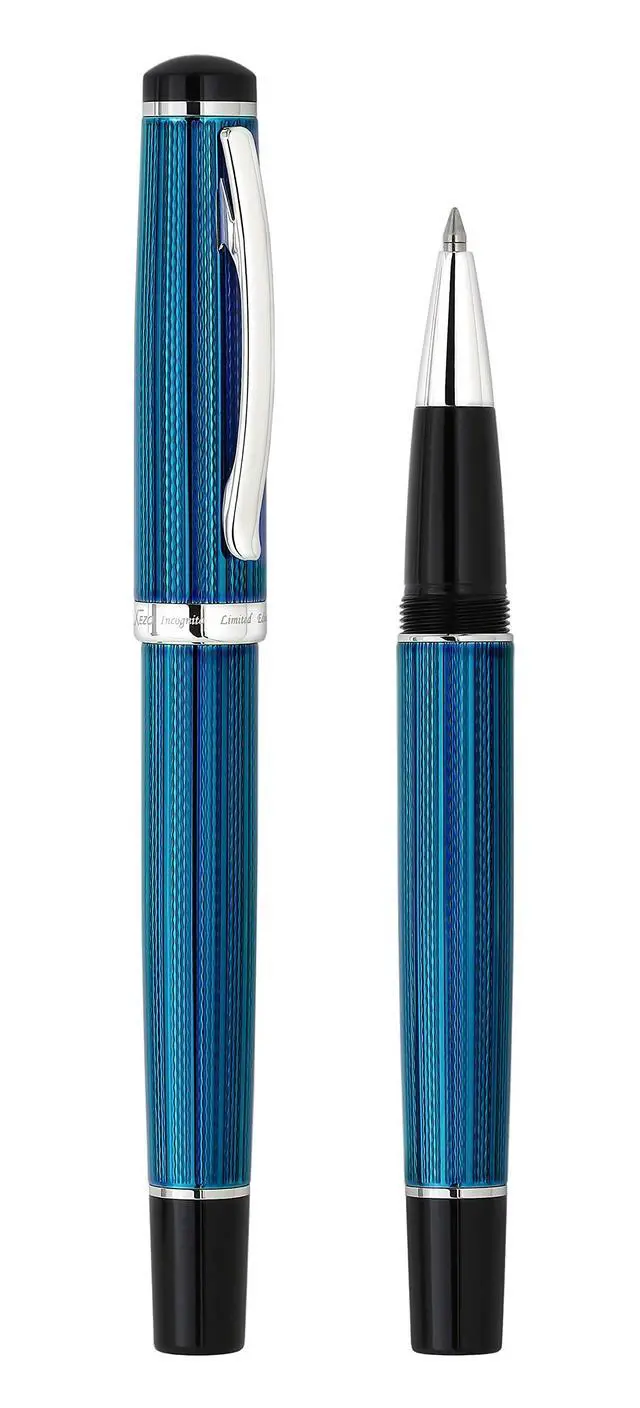 The Incognito series of pens was created with the goal to produce a quality, weight-balanced luxury pen with a comfortable grip. The weight distribution of the pens body was designed to allow for the friction to be minimized at the tip of the pen. This series is produced in 500 pieces and each pen is numbered by engraving. Each pen is produced with. 999 platinum-plated fittings, and the body is made of solid brass with diamond cut engraving. The fountain pen features a screw-on cap, and the parts, including the refill, are German-made.