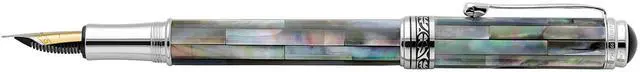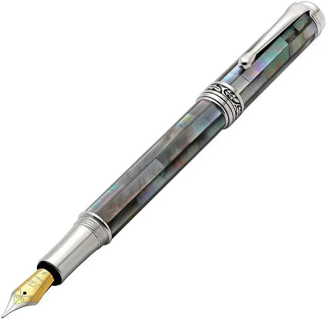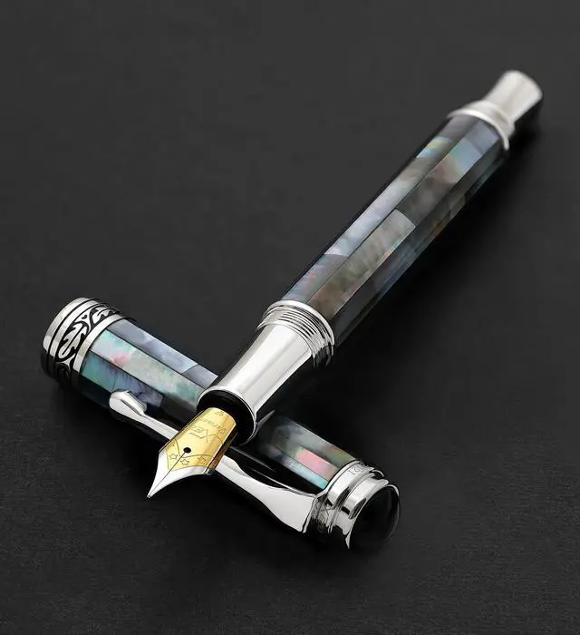 Please note: The mother of pearl panels used for this model may exhibit small, unavoidable surface fissures. This is a natural result of the high-temperature clear coating process ^^ These pens have been polished by hand to create a perfectly smooth, round-shaped barrel. Fine/extra-fine point stainless steel nib ( 0.35 mm). Screw-on cap. Body is made from solid brass. Black mother of pearl is inlaid onto the barrel, then coated in multiple layers of clear lacquer for a protective and glossy finish ^^. 999 platinum-plated brass fittings. Each pen is handmade, unique, and serialized in a limited edition production ^^ The fountain ink refill is a Standard International / European size cartridge and is selectively compatible with a variety of commercially available fountain ink refills ^^