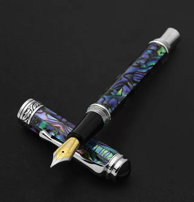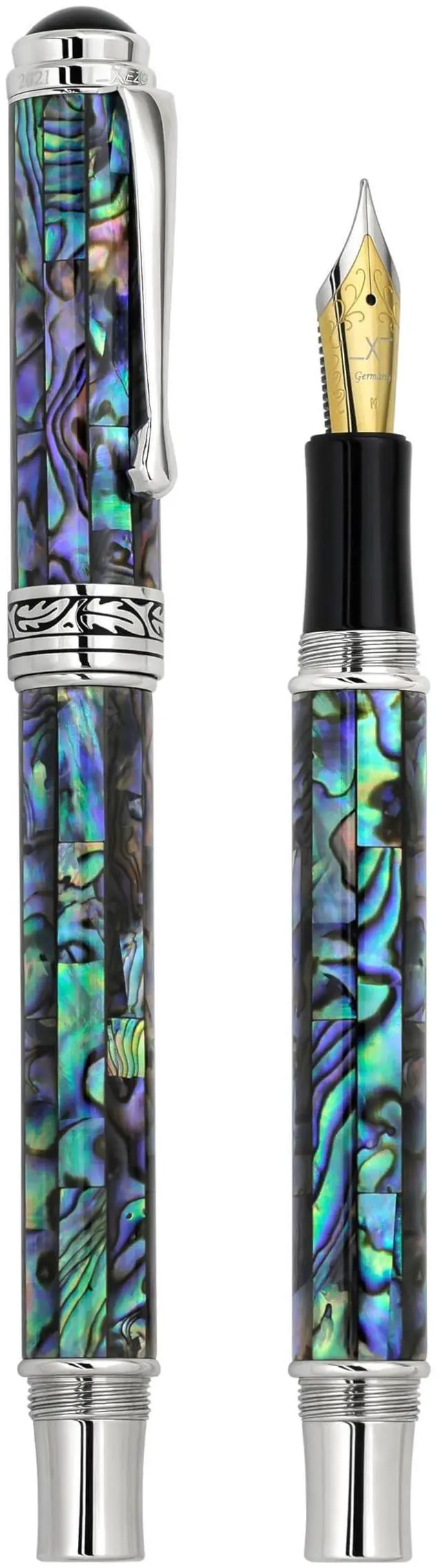 Set comes with the pen, gift box, 4 cartridges, piston converter, certificates, and a 3-year warranty card ^^ Xezo uses AAA-grade Paua abalone from Chatham Islands, known for vibrant hues. Medium stainless steel nib. Screw cap. Iridescent Paua abalone shell inlaid on a solid brass base, then coated for high gloss and durability. Pure. 999 platinum-plated fittings. Handmade and serialized in a limited edition ^^ These sea shell panels can range from green to black, along with red or blue overtones. Sea shells are natural materials; distinctions in the color and texture may occur, adding beauty and uniqueness to each of these pens ^^ The fountain ink refill is a standard / international size cartridge and is compatible with a wide variety of commercially available refills ^^