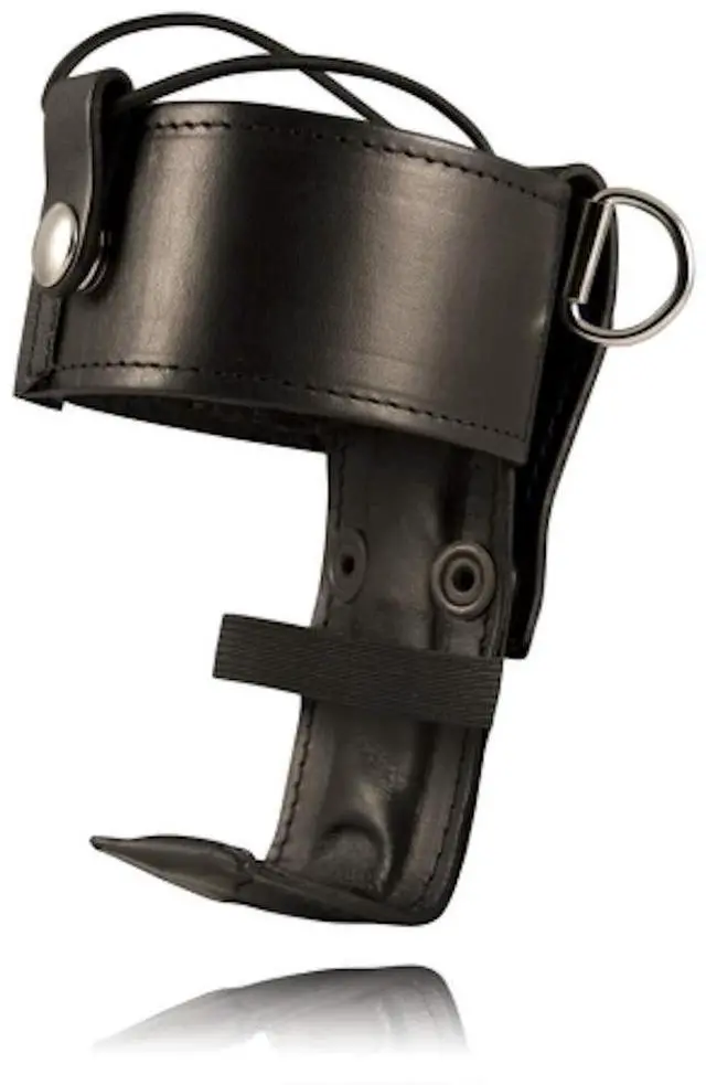 5" tall 2" wide leather strap, lined with Hook and Loop for adjustable closure Leather covered steel backwall provides a base for the radio to sit on Elastic strap holds the radio securely around the lower portion Black, Gold or Chrome finishes are available on request Two safety pull-the-dot snaps allow easy attachment to your duty belt