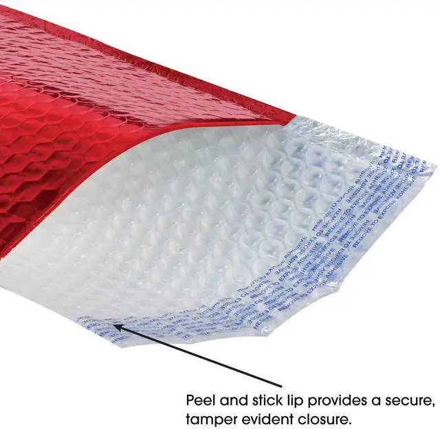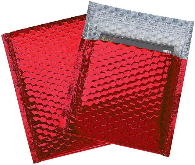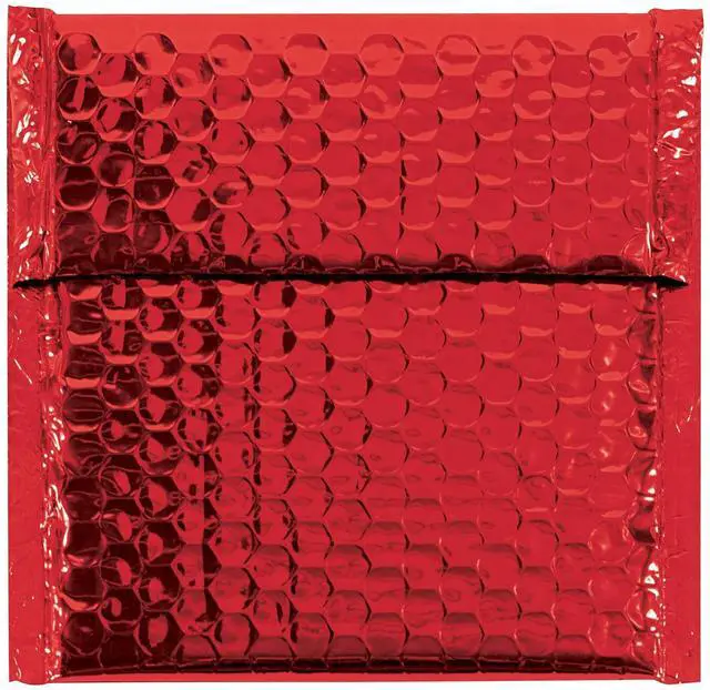 7" x 6 3/4" Red Glamour Bubble Mailers. Get the most out of your mailing - protect your shipment and grab your customer's attention! Bright and shiny red metallic exterior. Lightweight and moisture resistant. Features a peel-and-seal adhesive closure.