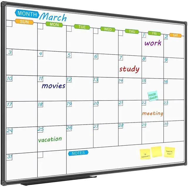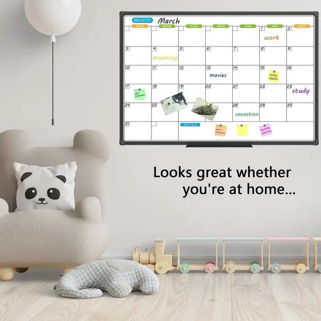 MAGNETIC & CALENDAR WHITEBOARD SURFACE: Surface can be used to mark dates meetings and appointments, Organize weekly plan, never forget important calendar, Strong magnetic performance, easy to put notes, pages, documents, photos, graphs and cards on. Creating more working, learning and playing experience. ^^ SMOOTH & ROBUST DRY ERASE PERFORMANCE: Smooth Scratch-Resistant surfaces, enjoy writing message notes on 47.5" x 34.5" calendar board, easily dry wipe with all dry-erase markers. ^^