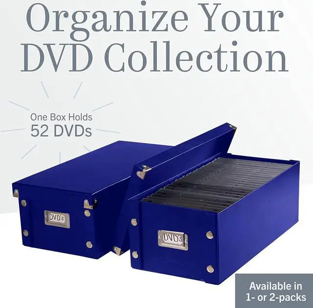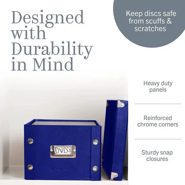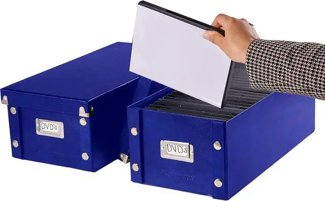 CD/DVD Storage Box holds 60 CDs/DVDs in full jewel cases, 120 CDs/DVDs in slim cases and 330 CDs/DVDs in CD sleeves. Design features heavy-duty fiberboard panels and industrial-size snaps. File storage pieces ship and store flat, and can be assembled in a snap. Exterior features leather like laminate. The front of the box has a chrome card holder for labeling.