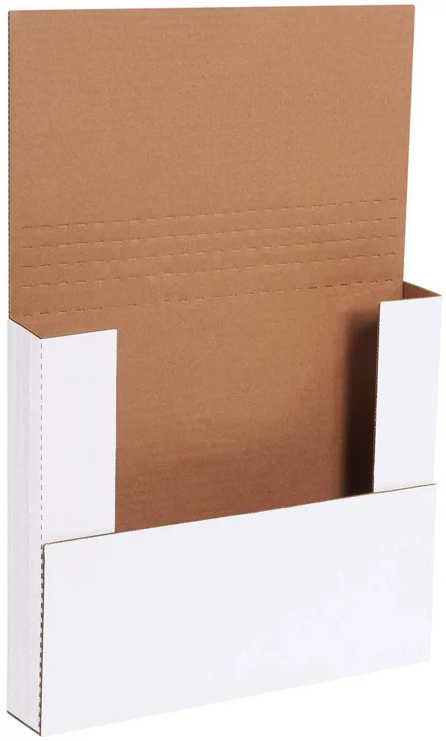 12 x 10 1/2 x 2" White Easy-Fold Mailers Great for mailing books, catalogs and framed pictures. Scored at multiple depths for flexibility. Quickly package items. No carton set up. Simply place product in the center, fold in the sides at your desired depth and seal with tape. Attractive 200#/ECT-32-B white corrugated construction makes a quality impression.