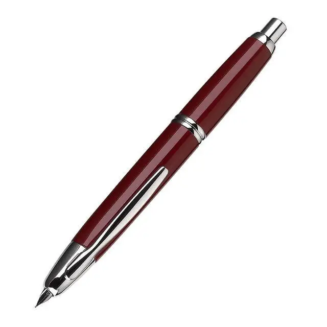 This Vanishing Point fountain pen by Pilot features an ingenious patented design that eliminates the need for a cap. The top push button advances and retracts the nib inside the metal body. This pen is finished in red with rhodium plated accents, including the18 karat gold nib in Medium width. This wonderfully unique pen is packaged in a gift box that includes a blue ink cartridge, cartridge cap, and ink converter.