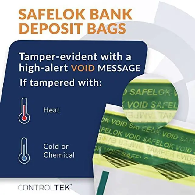 • CONTROLTEK SafeLOK bank deposit bags are tamper-evident with a high-alert void message displaying if the bag has been tampered with cold or chemicals. Thermochromic ink turns red if subjected to heat.