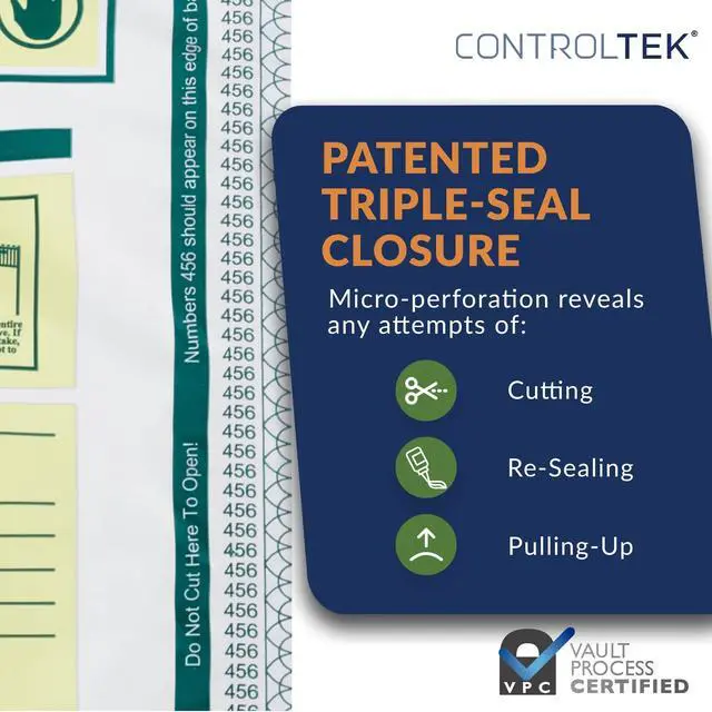 • The patented triple-seal closure features a security border that leaves no openings after sealing. Micro-perforation immediately reveals any attempt to pull up the closure to prevent attempts at cutting the cash bag open and re-sealing.