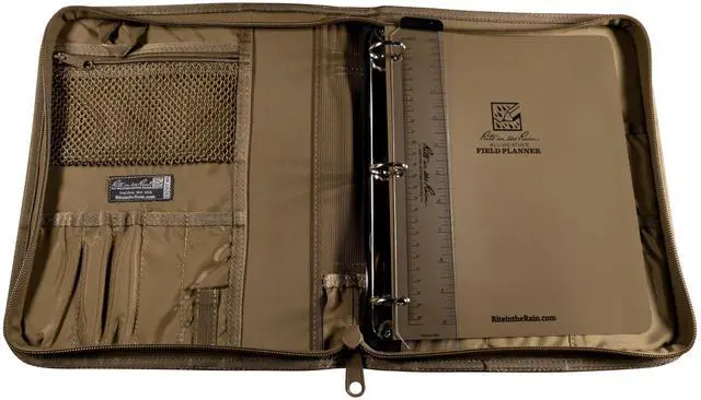 The Rite in the Rain all-weather field planner is a durable, comprehensive companion for the organization and protection of your notes and writing essentials. Hardy cordura fabric and smooth, reliable ykk zippers are highlights of the planner's uncompromising build quality. our patented weatherproof paper survives poor weather and rough use. sewn-in pen slots and pouches store everything you'll need to write in the field. the standard multicam cover matches all of your field gear. keep your notes and gear organized and protected with the authoritative all-weather planner by Rite in the Rain.