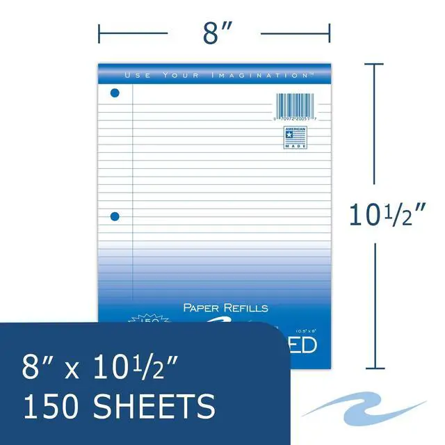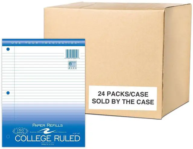 Founded in 1887 by D. M. Bare, Roaring Spring Paper Products has been an integral part of the Roaring Spring community for more that 130 years. Employing over 200 people, the company prides itself on remaining a family-owned, American small business. Looseleaf filler paper. Smooth, 15#, white writing paper. Case of 24 packs, each pack contains 150 College ruled sheets with a red margin line. The paper is 10.5 x 8 and 3-hole punched. Polywrapped with a printed topsheet. Proudly made in the USA!