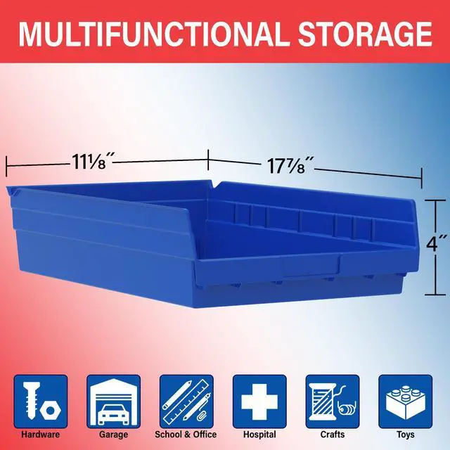 Stay organized with Akro-Mils Shelf Bins, the versatile, durable solution for every space. Made from industrial-grade polymers, these heavy-duty storage containers are a long-lasting alternative to weak cardboard options. Waterproof, easy-to-clean, and built to withstand indoor and outdoor use, theyre perfect for garages, kitchens, offices, closets, under sinks, or in cabinets. Designed for spill-free retrieval, their unique lip allows effortless tilting forward for easy access to tools, supplies, or household items. Customize your storage with optional dividers, bin cups, and label holders (sold separately) and choose from a variety of colors for an organized and efficient system.