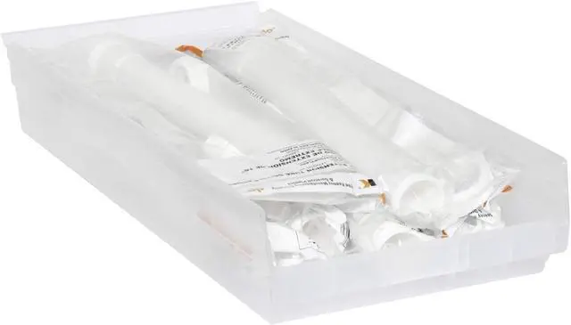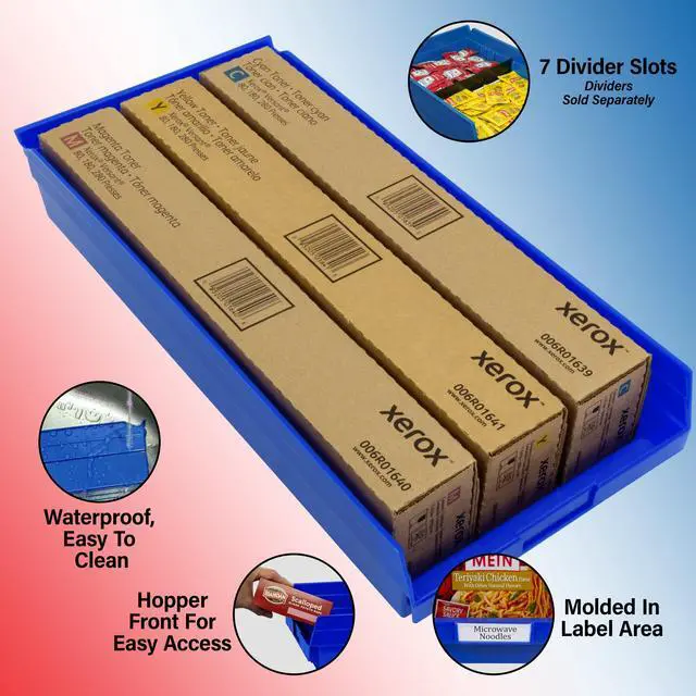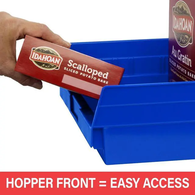 Great for a wide range of uses, including, bathroom cabinet storage, kitchen organization, office organization, closet organization, tool storage, and office storage. With a curved-bottom hopper front and space-saving nesting, these bins fit 12", 18", or 24" deep shelves and vertical storage units.
