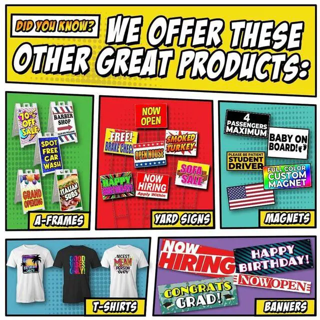 • This is NOT a cheap fabric banner. Tampa Printing uses a high quality, heavy duty, premium 13 oz indoor/outdoor vinyl banner material. All banners are printed using industry best latex ink technology, are UV and water resistant, and withstand hot and cold conditions. They include metal grommets in each corner for easy hanging. Larger sizes receive extra grommets and reinforced hemming along all sides. Dimensions are Height (top to bottom in inches) and Width (left to right in inches).