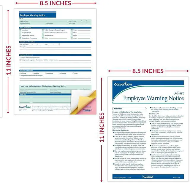 Dont ignore poor employee performance or misconduct or put your company at risk by failing to put warnings in writing. Documentation is a vital step in managing and correcting employee disciplinary issues, in addition to justifying a decision to terminate. The ComplyRight Employee Warning Notice, 3-Part captures essential details and helps establish a consistent disciplinary procedure, which can protect your business in case of a lawsuit. The attorney-approved form provides ample space to document the type of violation (including the date and time of the incident), actions to be taken, and the employees response to the warning.