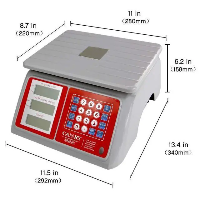 Waterproof Price Computing Scale: Featured with a 3-line big bright LCD screen, this computing scale shows weight, unit price, and total price on the front and back display, which is easy for both sellers and customers to read while in use. ^^ Green Backlight LCD Price Computing Scale: This scale work with 3 x 1.5V D size batteries. Please replace the batteries when low power indicator. No need charger and charging cable. ^^ Green Backlight LCD Price Computing Scale: Easy to Clean Surface - Wash-down 12" x 9" Stainless Steel Platter.