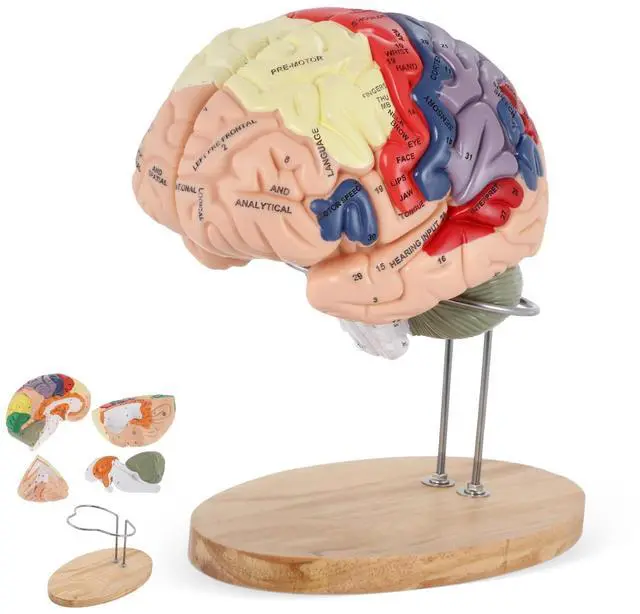 DURABLE & EASY TO CLEAN - Made of green PVC plastic that is sturdy, washable, and resistant to breaking. ^^ CLEAR & DETAILED DISPLAY - BEAMNOVA 2 Times life-size human brain model features 4 detachable parts with labels, ideal for students, teachers, and healthcare professionals. ^^ EASY TO ASSEMBLE & DISPLAY - All 4 pieces separate for closer examination and fit back together like a puzzle. Comes with a solid wooden stand for both study and professional presentation. ^^ STUDY GUIDE INCLUDED - Includes a detailed anatomical chart highlighting cerebral hemispheres, brain stem, and cerebellum for deeper learning.