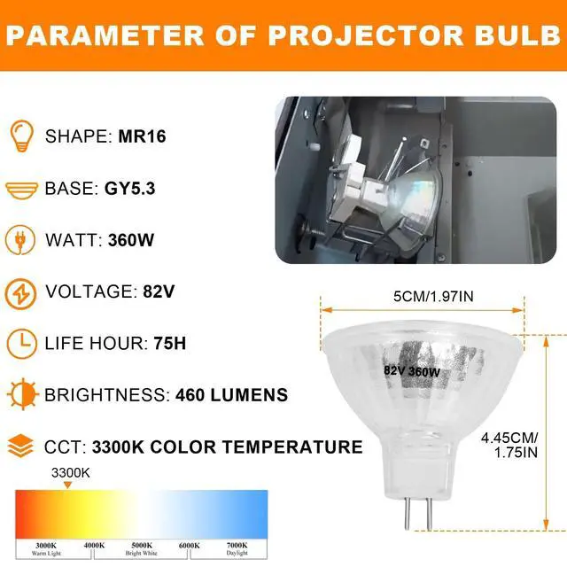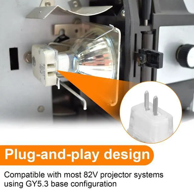 Easy Installation: Plug-and-play design with precisely aligned pins for tool-free replacement. Compatible with most 82V projector systems using GY5.3 base configuration