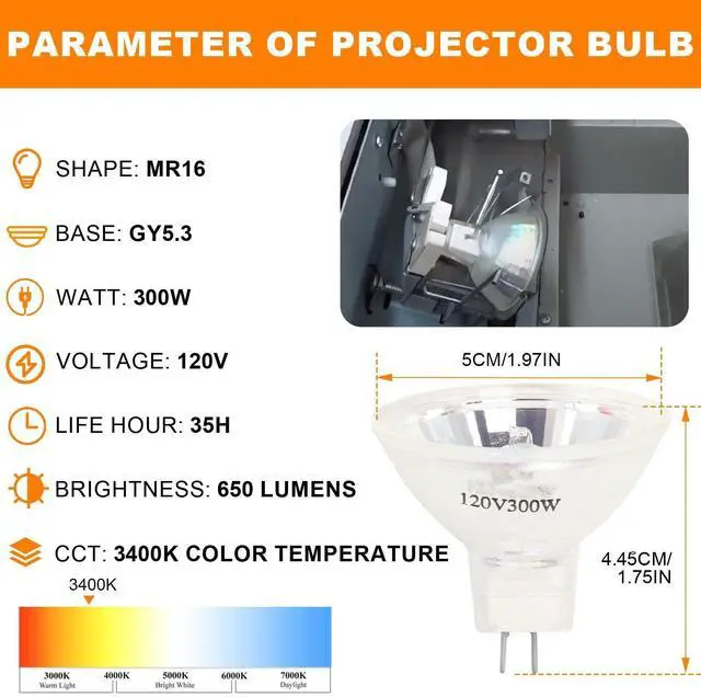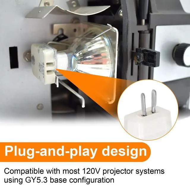 Easy InstallationPlug-and-play design with precisely aligned pins for tool-free replacement. Compatible with most 120V projector systems using GY5.3 base configuration