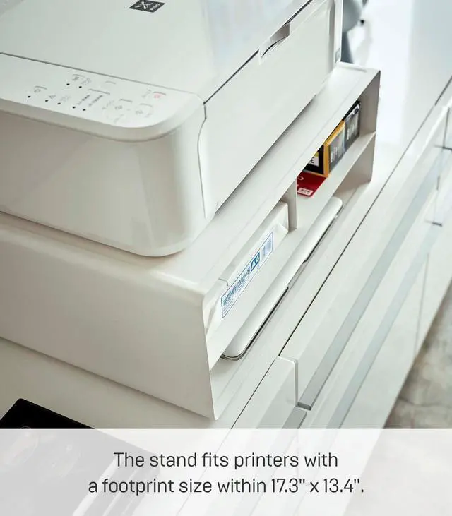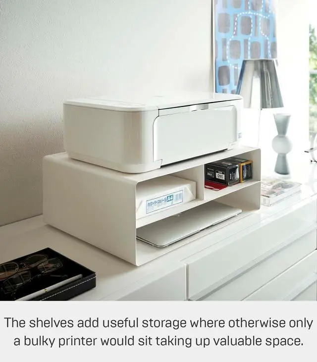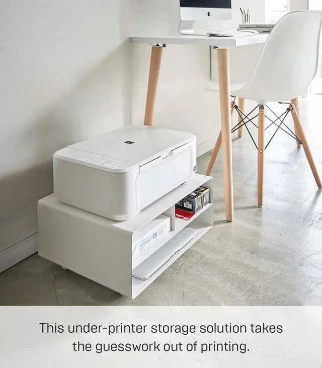 This under-printer storage solution takes the guess-work out of printing. Out of paper? Out of ink? Look no further. The shelves add useful storage where otherwise only a bulky printer would sit taking up valuable space. Store extra reams of paper, ink, and office supplies, keeping your home office looking clean, organized, and professional. The desktop printer stand is equally at home on the floor or desk. If mobility is what you're after, simply attach the provided wheels. Available in white and black. The upper shelves accommodate standard letter-sized (US) 8.5 x 11 inch paper.