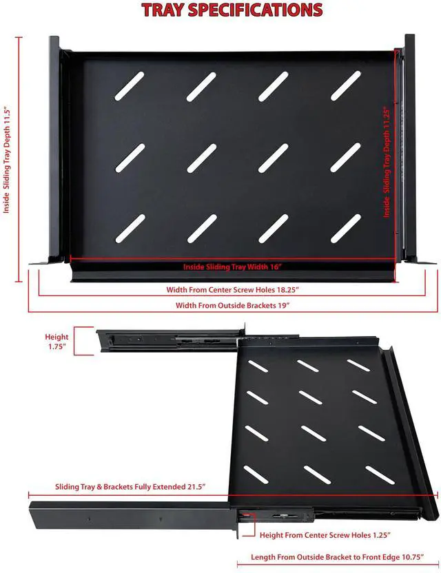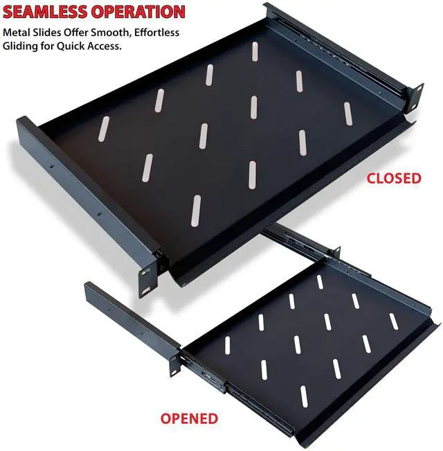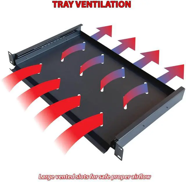 This 1U rack shelf is designed to fit standard 19" cabinets and racks, making it perfect for mounting various IT, AV, and network devices. With an 10-inch depth, it maximizes vertical space while accommodating a range of components. Its all-metal construction, coated with a durable powder finish, ensures long-lasting protection and a sleek, professional appearance. The vented slotted design enhances airflow, helping to prevent overheating and maintain optimal performance for your equipment.