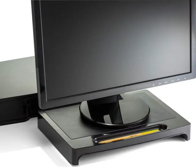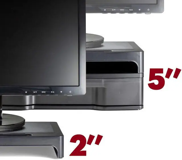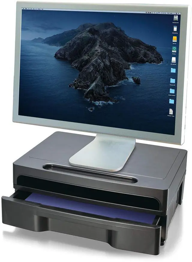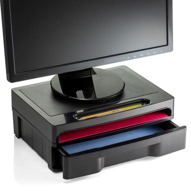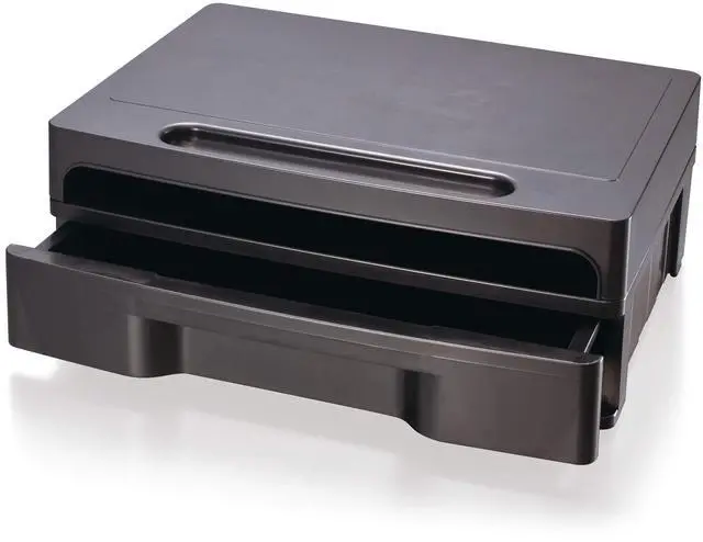 Holds flat screen monitor while securing important files or papers. Holds monitor at eye level, security drawer holds important documents. Drawer is HIPPA Compliant. Drawer may be used separately and to change monitor height. 13-1/8 x 9-7/8 x 5 Inches. Heavy weight with contemporary rounded corners. Compliments other Officemate 2200 Series desk accessories. Black.