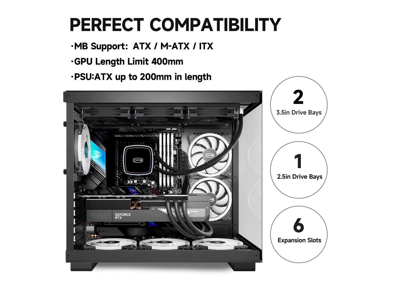 - ULTRA-LARGE CAPACITYSpace of CPS pc case is configured for each component ,will be fully compatible with your new computer components.ATX/M-ATX/ITX Motherboard Support 360MM Radiator Support CPU Cooler Height 175mm GPU Length Limit 400MM Power Supply Type ATX up to 200MM equipped with 2 × 2.5 " SSD and 2 × 3.5 " HDD installation Expansion Slots 6pcs I/O Ports:USB 3.1 Gen 2 Type-C,2 x USB 3.0,MIC & AUDIO,LED Swtich Button,Power Button