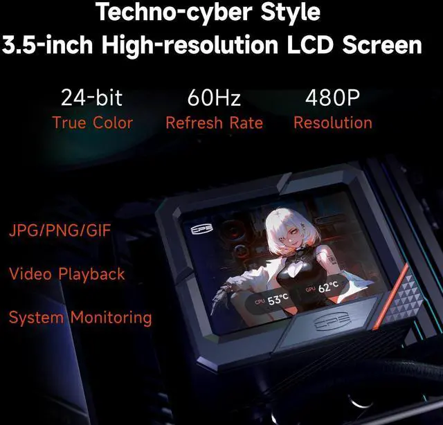 3.5-inch IPS DisplayStunning 480x480 resolution for vibrant colors and wide viewing angles, customizable with system information, animations, or video playback.