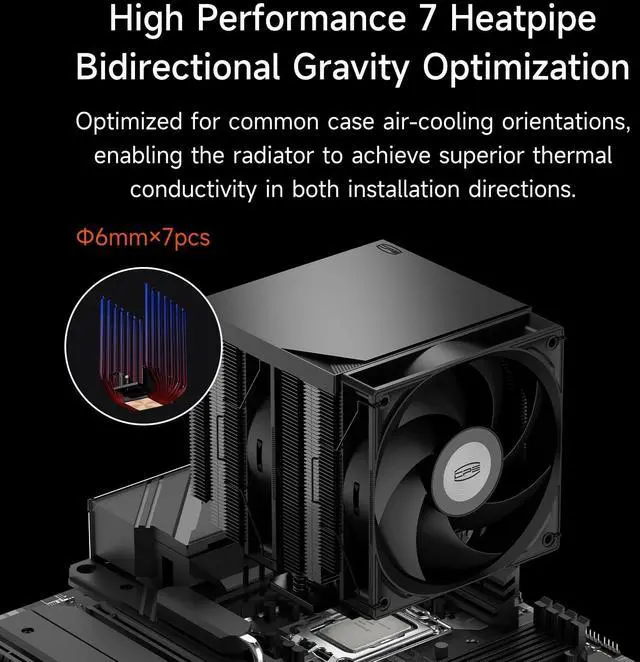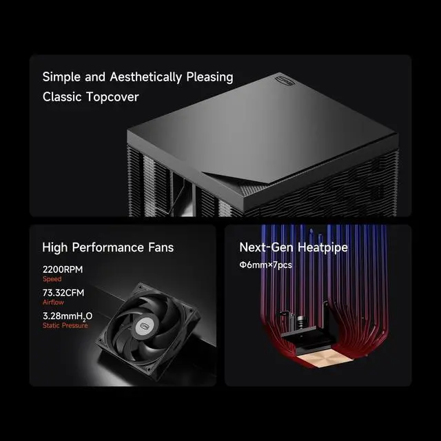 [76mm Heatpipes for Extreme Thermal Efficiency] Equipped with seven 6mm gravity-optimized heatpipes, the RT720 TC delivers exceptional heat transfer for high-performance and overclocked CPUs. ^^ [Dual-Tower Reinforced Structure] The dual-tower cooling design maximizes heat dissipation surface area, while the reinforced anti-deformation bracket ensures long-term stability and structural strength. ^^ [Premium Copper Reflow Soldering Base] A full copper reflow soldering base provides excellent contact with the CPU surface, improving conduction efficiency and maintaining lower temperatures under heavy workloads. ^^ [120mm Hydraulic Bearing PWM Fan] Features a high-pressure 12012025mm hydraulic bearing fan with 73.32 CFM airflow and 3.28 mmHO static pressure for powerful, quiet, and efficient cooling.