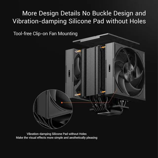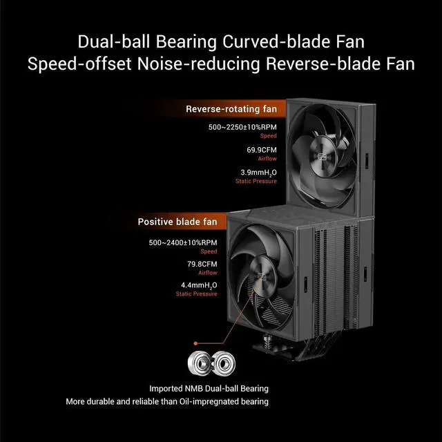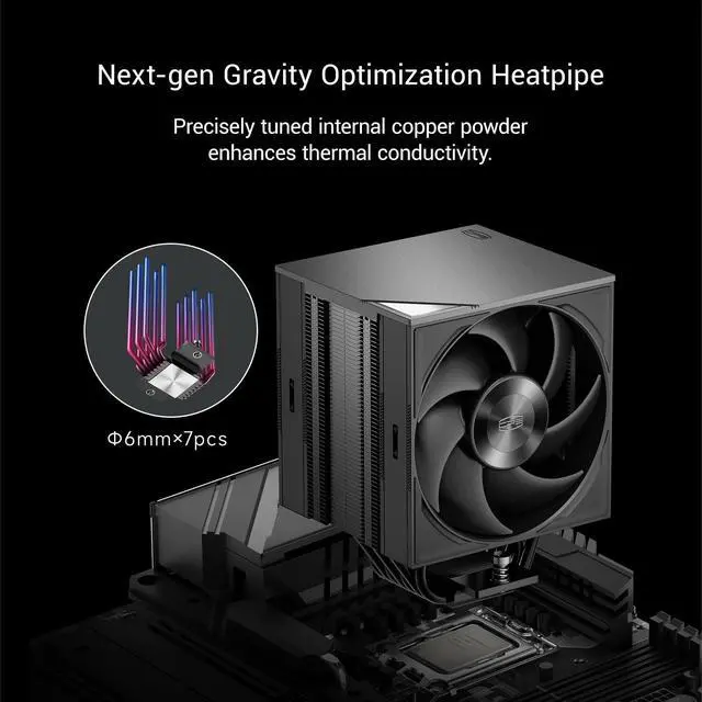 [Flagship Cooling Performance] Equipped with 7 high-sensitivity heatpipes and a 60mm enlarged wavy flow finstack, the RZ700D provides exceptional heat dissipation for high-end CPUs, ensuring your system stays cool under heavy workloads. ^^ [Ultra Silent F5 S120 Fan] Features a durable Dual Ball Bearing PWM fan. The forward blade offers up to 79.8 CFM airflow and 4.4 mmH2O static pressure, while the reversed blade option provides flexible airflow management without sacrificing silence. ^^ [Premium Design & Easy Installation] The magnetic top cover and clip-free fan mounting system make installation and maintenance a breeze.