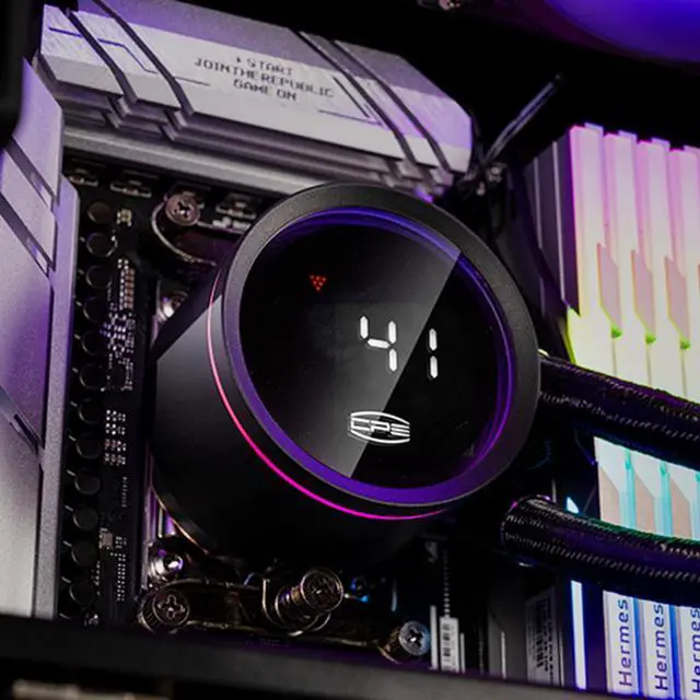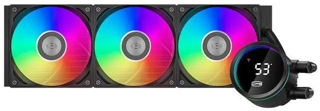 High-Performance All-in-One Liquid CoolerPCCOOLER DA360 PRO ARGB Digital Liquid CPU Cooler with 270 Rotatable LCD Display, Engineered for the latest Intel i9/i7/i5 and AMD R9/R7/R5 CPUs, featuring a 360mm radiator, three pre-connected daisy-chainable 120mm fans, a copper cold plate, and an efficient pump head for ultimate cooling performance. ^^ 270 Rotatable LCD Digital Display Real-time CPU temperature monitoring with a customizable rotatable screen for personalized viewing angles. ^^ Infinite Halo ARGB Effect Vibrant RGB lighting on both the water block and fans, adding a stunning visual effect to your PC build.
