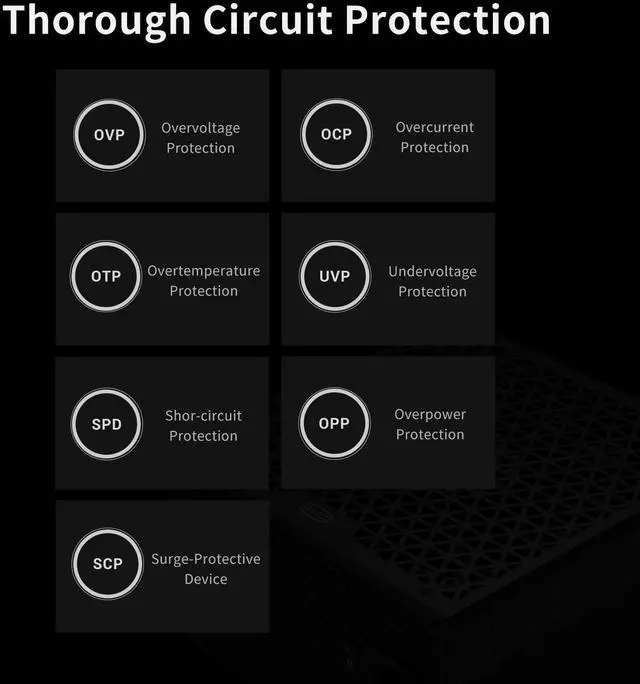 Stable Power & Full Protection Active PFC and DC-to-DC topology with complete protection including OVP, UVP, OCP, SCP, OPP, OTP, and SPD for safe operation.