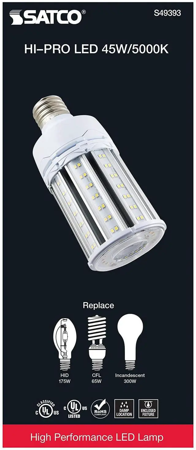Satco's 45-watt Hi-Pro LED lamp is an energy efficient lighting solution for large scale lighting applications. Perfect for gymnasiums, factory floors, health clubs, and warehouses, this lamp is designed to deliver clean, efficient LED light. This versatile lamp has a corncob shape and delivers 35, 000 hours of cool white light.