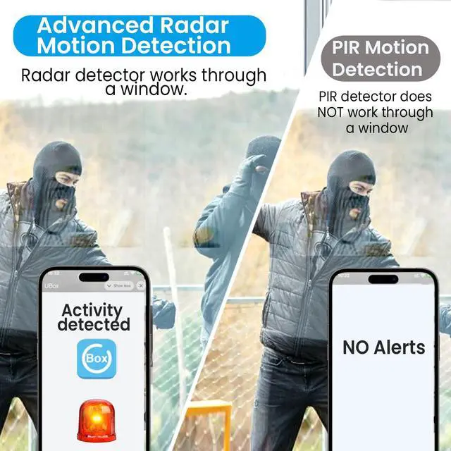 [(Advanced Radar Motion Detection: Motion detection through window/glasses)] Upgraded from PIR to radar motion detection, this security camera is more sensitive than PIR detection, it has longer detection range of up to 12M. More penetration ability, for example camera detects motion through the window, it immediately sends you an alert via the mobile app. At the same time, all alarm videos are stored in memory card or cloud.