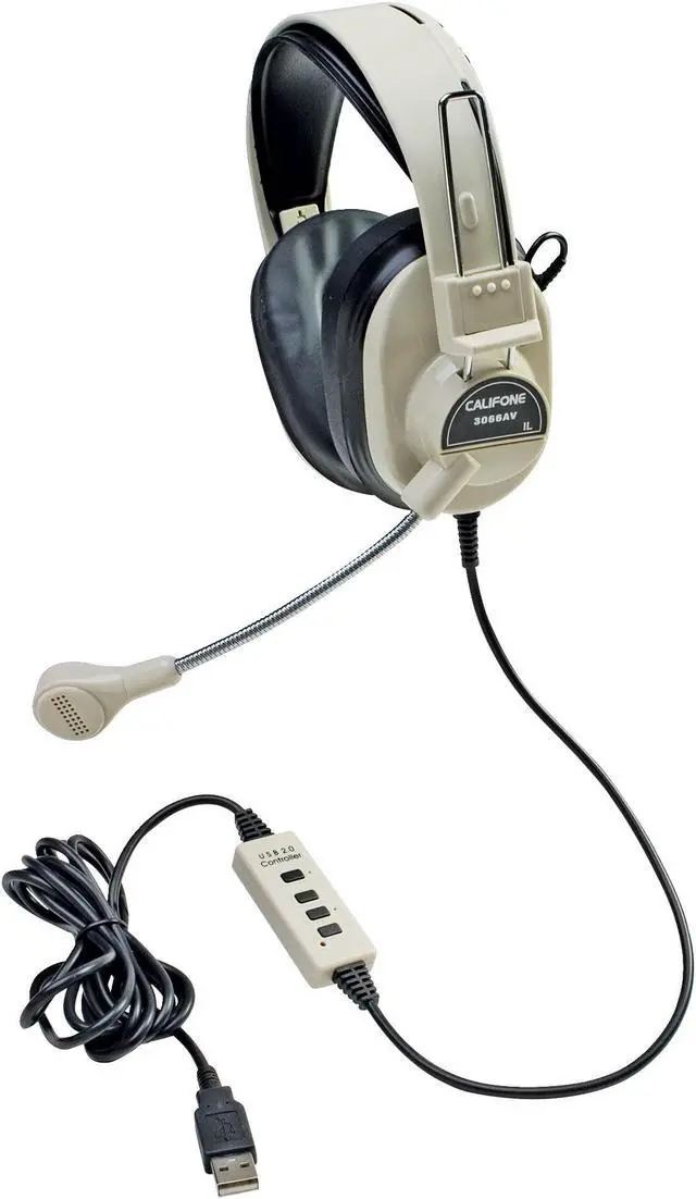 The 3066AV-USB headset is one of Califone's most rugged headsets. The adjustable, plastic headband fits most sizes. Noise-reducing over-ear cups lower external volume and feature slotted baffles for added speaker protection. Leatherette ear cushions add comfort and are replaceable. Gooseneck microphone is noise-reducing, omnidirectional and encased in steel for added durability. The 6-foot straight cord is permanently attached to the ear cup, has inline volume control and a USB plug. Comes in Beige. 3 year warranty.