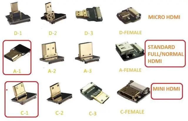 HDMI ends: 1. MICRO HDMI (6X 2.3 mm) 3 types available: MICRO D-1 90 degree; MICRO D-2 90 degree (reverse orientation of D-1); Micro D3 straight plugMicro female2. Mini HDMI( 10.5X 2.5 mm) 4 types available: MINI C-1 90 degree; MINI C-2 90 degree(Reverse orientation of C-1); Mini HDMI straight plug; MINI FEMALE plug3. Standard HDMI 2.0 (14x 4.5 mm) 4types available: Standard A-1 straight plug; Standard HDMI 90degree A-2; Standard HDMI A-3 90degree (Reverse orientation of A-2);