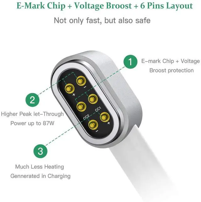 ^^ 87W Fast Charging: QC 3.0 and PD compatible, it only takes 90 mins to fully charge the MacBook Pro. With the E-Mark Chip, it supports up to a maximum of 20V/ 4.3A - 87W fast charging.