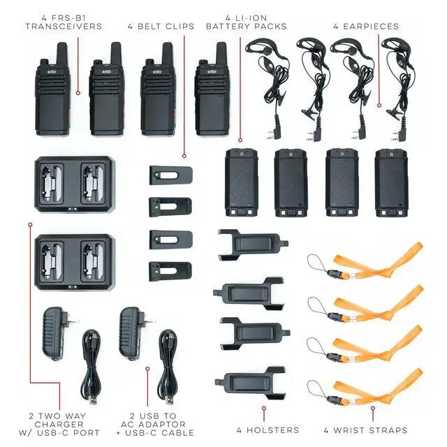 • Rugged and Versatile --- The FRS-B1 is IP54 weather resistant, meaning it can reasonably be used in all weather situations. The FRS-B1 is versatile with the included holster which allows the radio to quickly snap into a locked position in a pocket or on a belt. There are multiple charging options as well; the radios can be charged easily with any USB-C cable or they can be charged in the included docking station. The docking station can also charge backup batteries without the radios present.