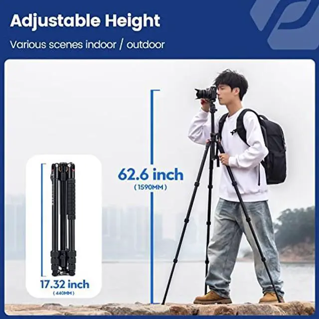 Compact & Travel-Friendly: This portable travel tripod weighs only 3.65 lbs and folds down to 17.3" (44cm). The 4-section aluminum legs extend from 8.85" to 62.6" ( 22.5 -159cm), supporting both low-angle macro photography and high-angle landscape shooting ^^