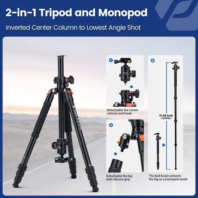 Tripod & Monopod: Easily convert the camera tripod leg into a 52" (132cm) monopod for added stability in handheld video, wildlife, or action shots. The detachable lightweight monopod can be even used as a hiking pole or selfie stick, perfect for outdoor travel photography ^^