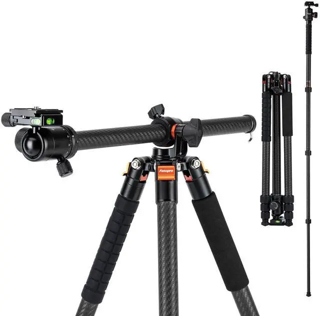 Horizontal Carbon Fiber Tripod: Release the horizontal adjustment knob to convert the tripod to horizontal center column mode, which is quick and easy. Horizontal center shaft is 17.28 inch/ 43.9CM long, can be rotated 360, also supports up and down movement during 360 horizontal rotation. It can be used for product photography, food photography, desk shot, macro photography, tilt shot, pan shot, panoramna shots, time-lapse photography with window or railing out.
