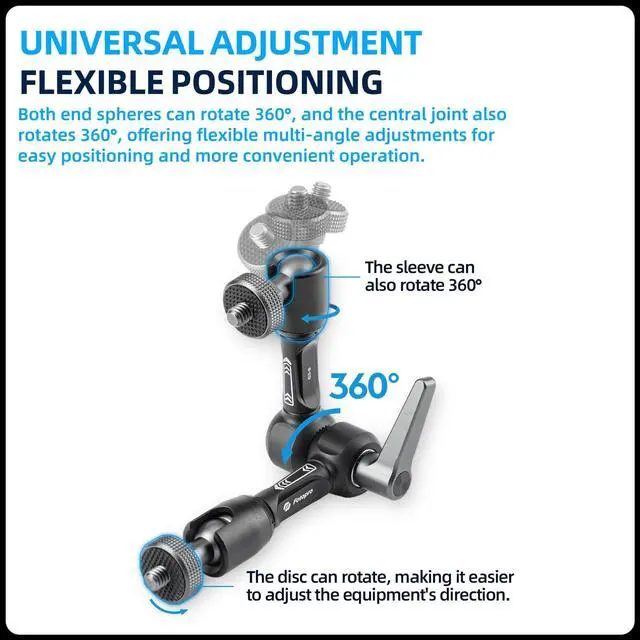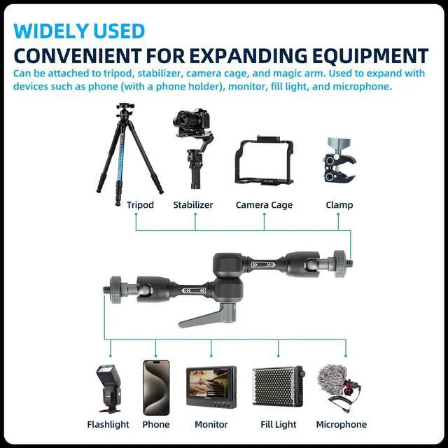 GS-08 magic arm net weight 0.12kg, length, width and height: 167.8X58.8X22mm. It can be used for tripod to extend mobile phone, fill light, microphone, etc., and also can be used with Video Rig, Power Clip, receiving sound equipment, etc.