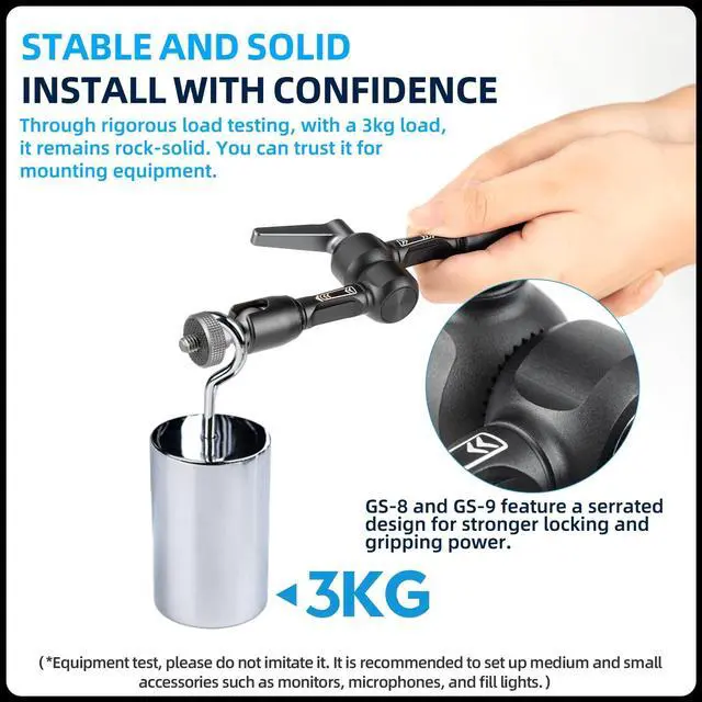 GS-08 magic arm net weight 0.12 kg, length, width and height: 167.8X 58.8X 22mm. It can be used for tripod to extend mobile phone, fill light, microphone, etc., and also can be used with Video Rig, Power Clip, receiving sound equipment, etc.