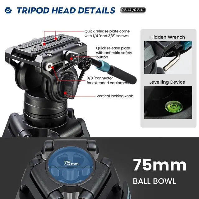 Smooth Motion: Featuring a 75mm half-ball leveling head and extendable padded pan bar for 360 panning and -75 to +90 vertical tilting, DV-3C professional tripod ensures smooth, cinematic video capture on any terrain ^^