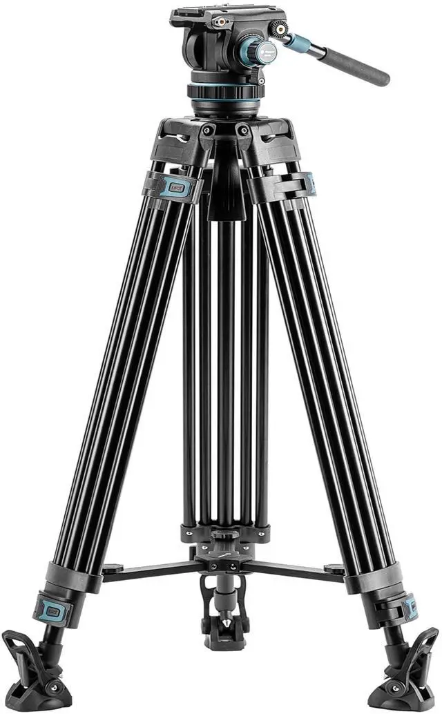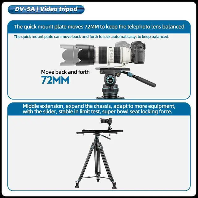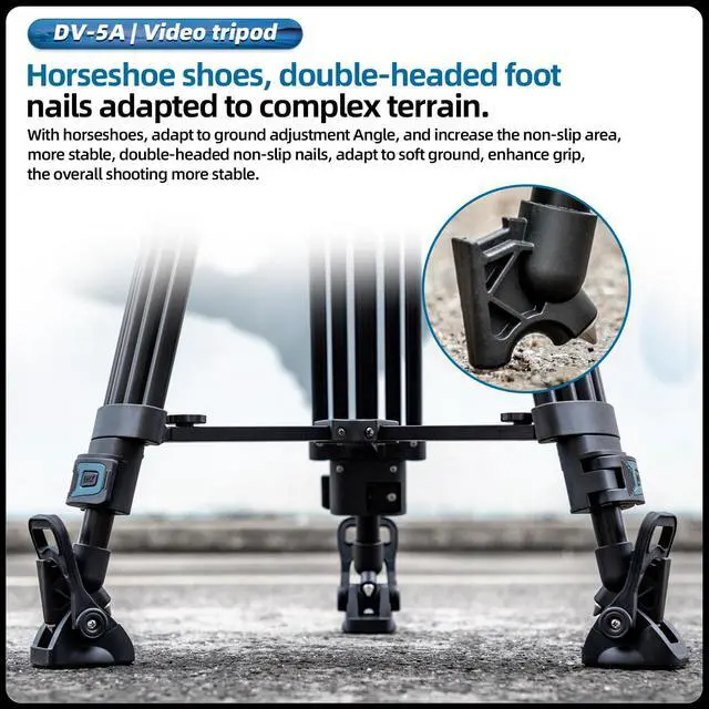 Video: The Fotopro DV-5A video tripod is crafted from premium aluminium with 22mm diameter tubes for enhanced strength and rigidity. The tripod stand alone supports up to 40kg ( 88.18 lbs), while the full set with fluid head supports 22.04 lbs, making it perfect for heavy camera rigs and long telephoto lenses like 800mm ^^ Horseshoe-Shaped