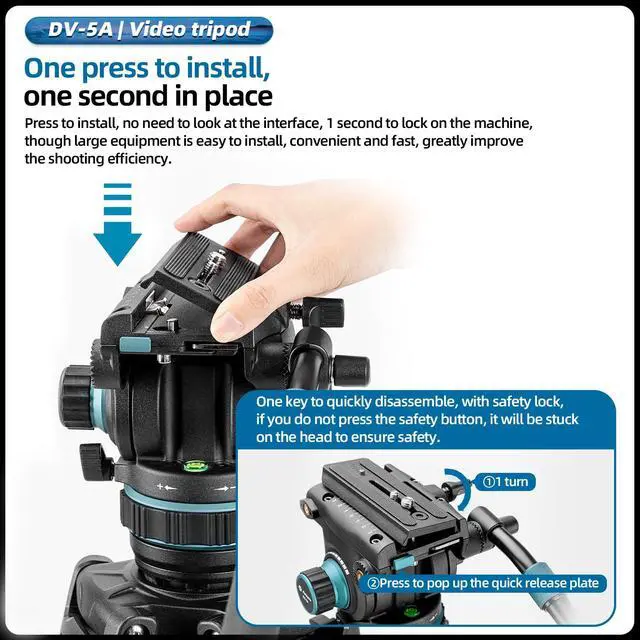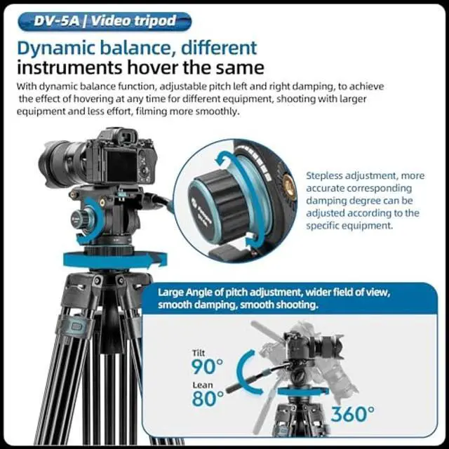 Damping Control: The professional fluid video head rotates 360 horizontally and tilts from -80 to +90 with smooth damping adjustment for precise control. The stepless drag system ensures vibration-free panning and tilting, while the handle can be mounted on either side for flexible shooting. A bubble level and quick leveling bowl seat guarantee accurate alignment ^^
